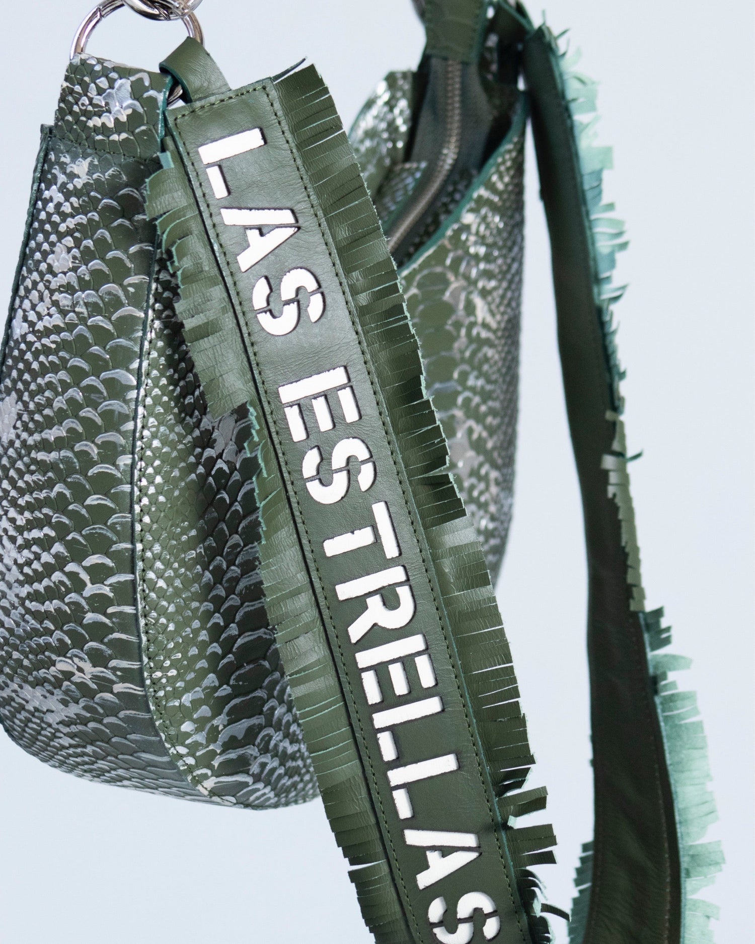 This hand-painted hands-free bag with fringed strap and phrase will add a touch to all your outfits. It has a top closure system by a zipper.