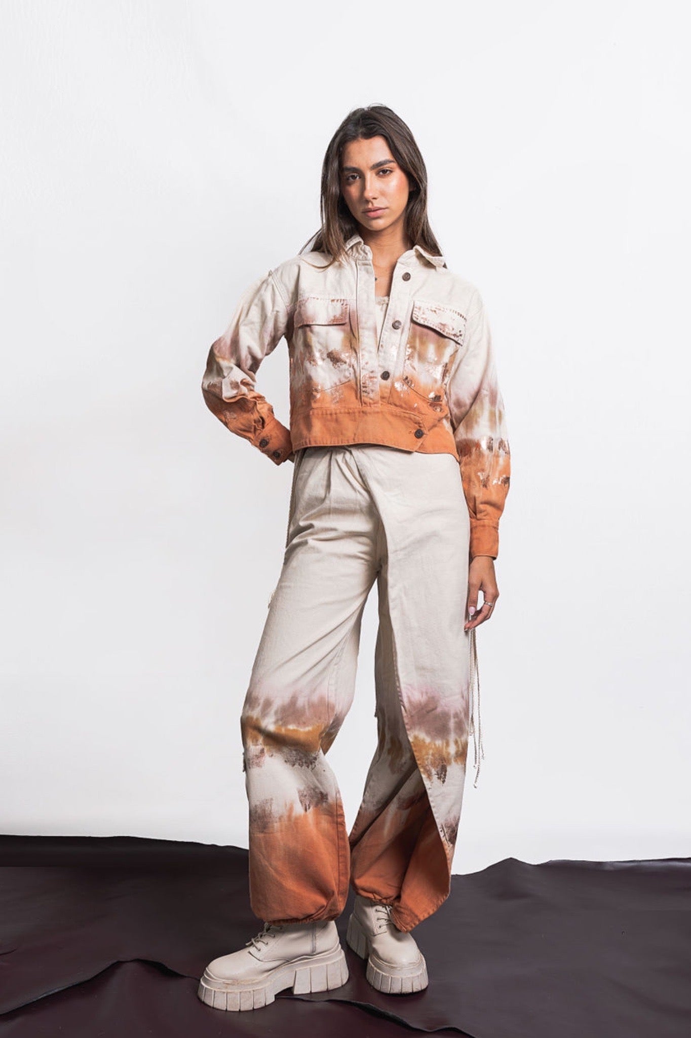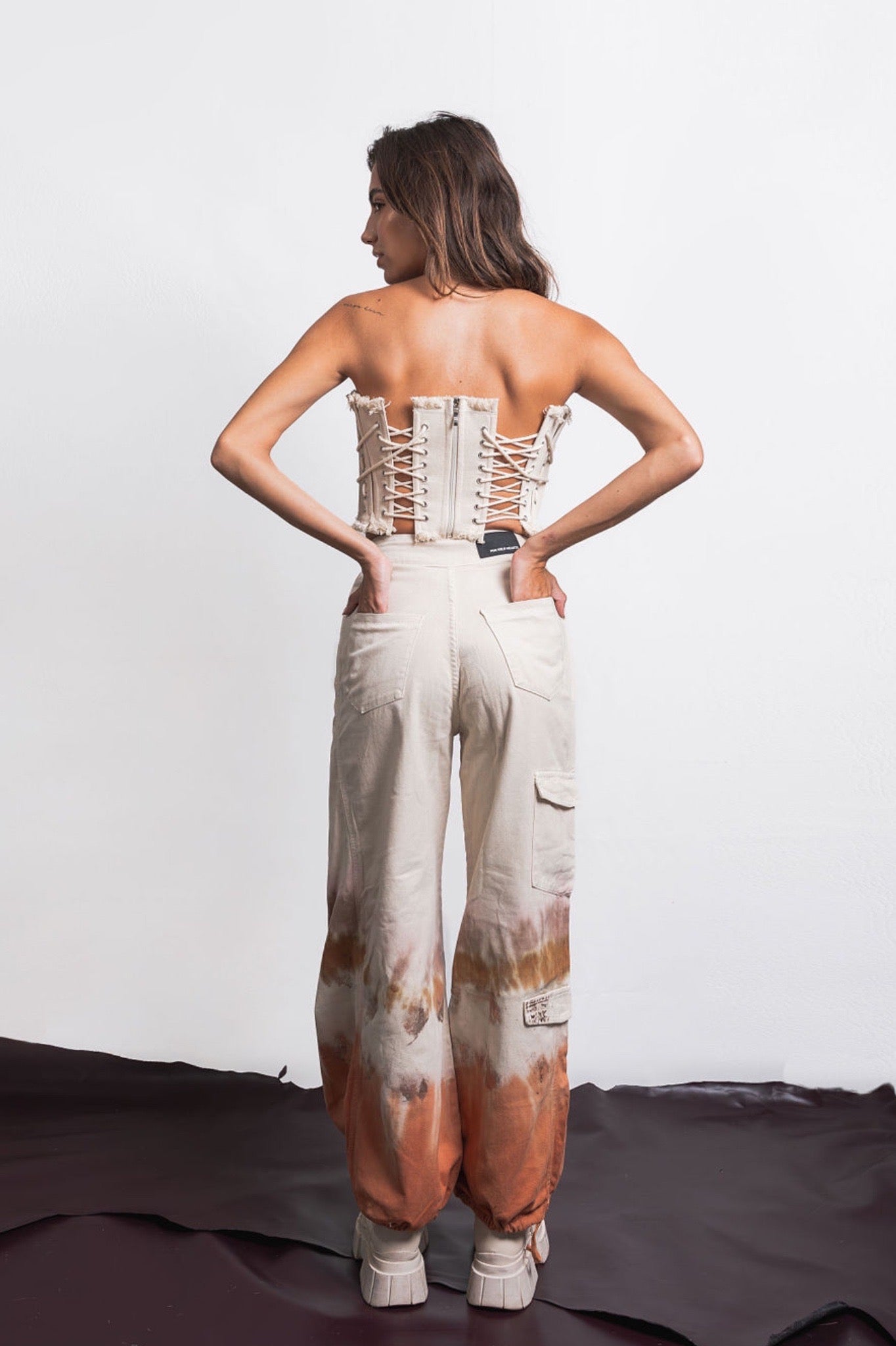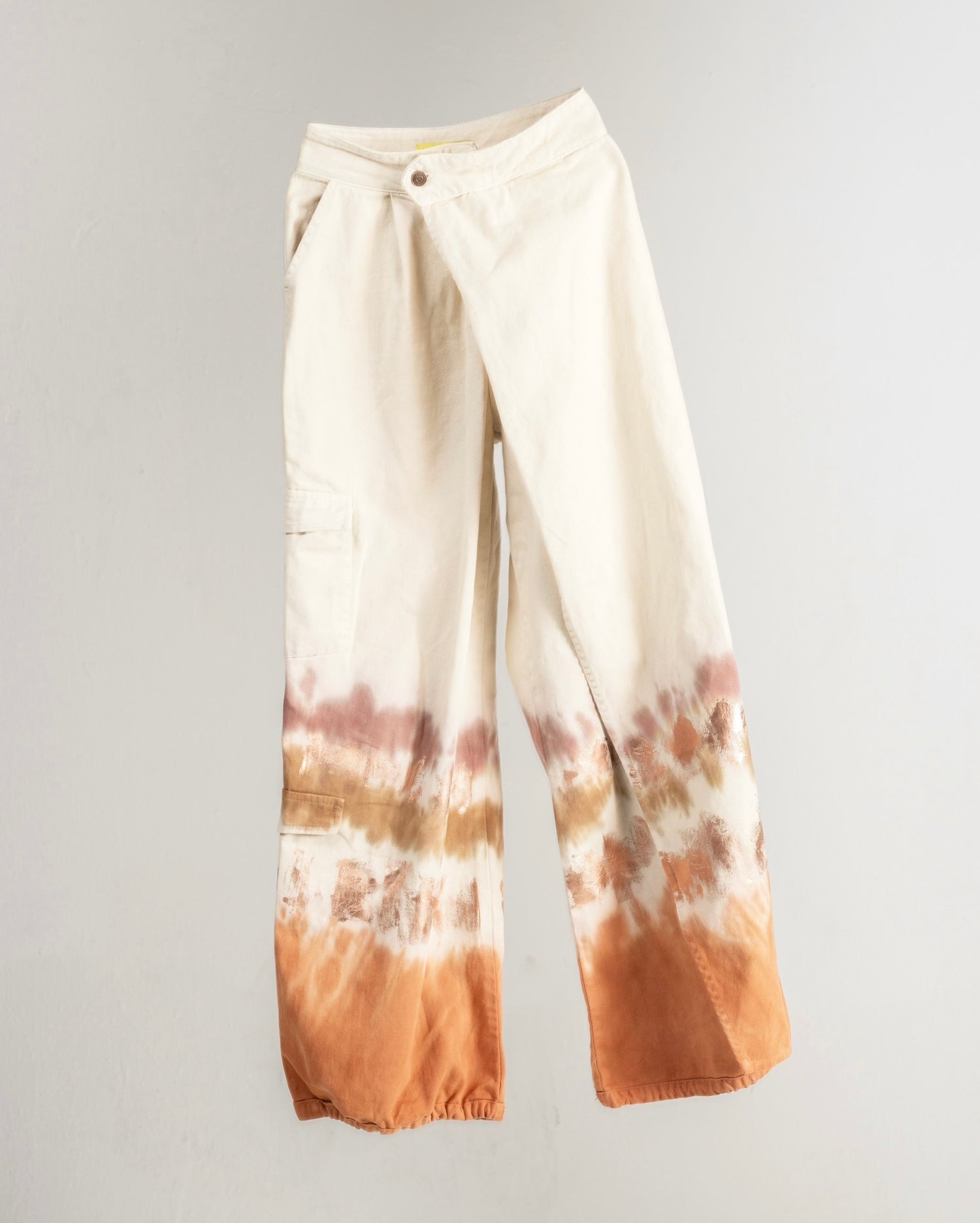 Drill cargo pants with a flare silhouette, front bolero, and an adjustable boot through a drawstring. This proposal with hand-dyed boots and foil details is perfect for creating innovative and sophisticated looks.
