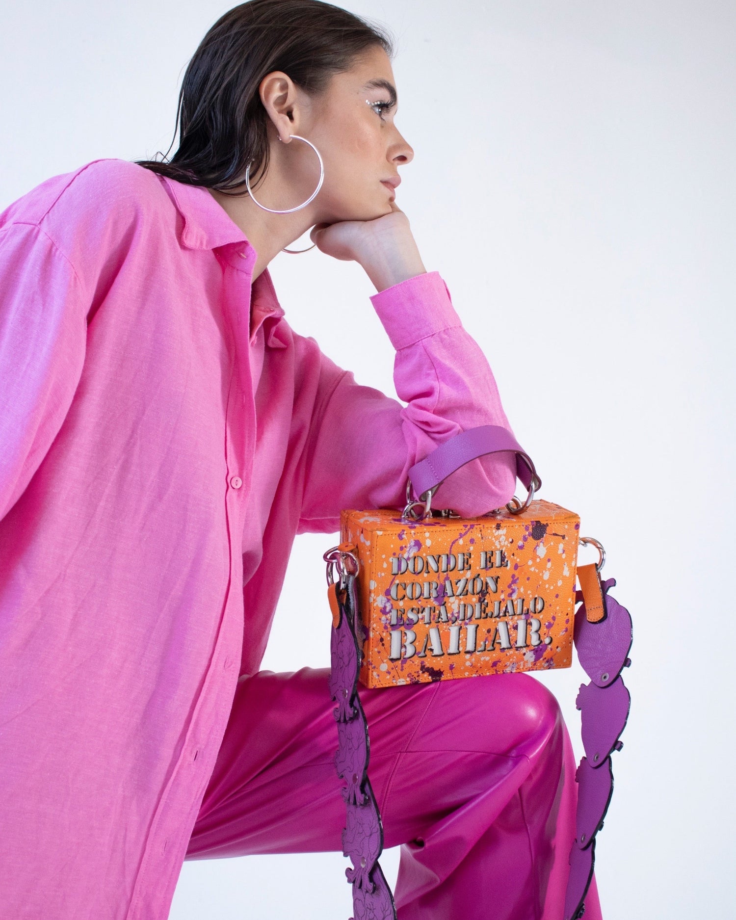 This hands-free box bag will add a touch to your looks, its heart strap will catch everyone's attention. Hand-painted bag with a locking system by a top clasp.