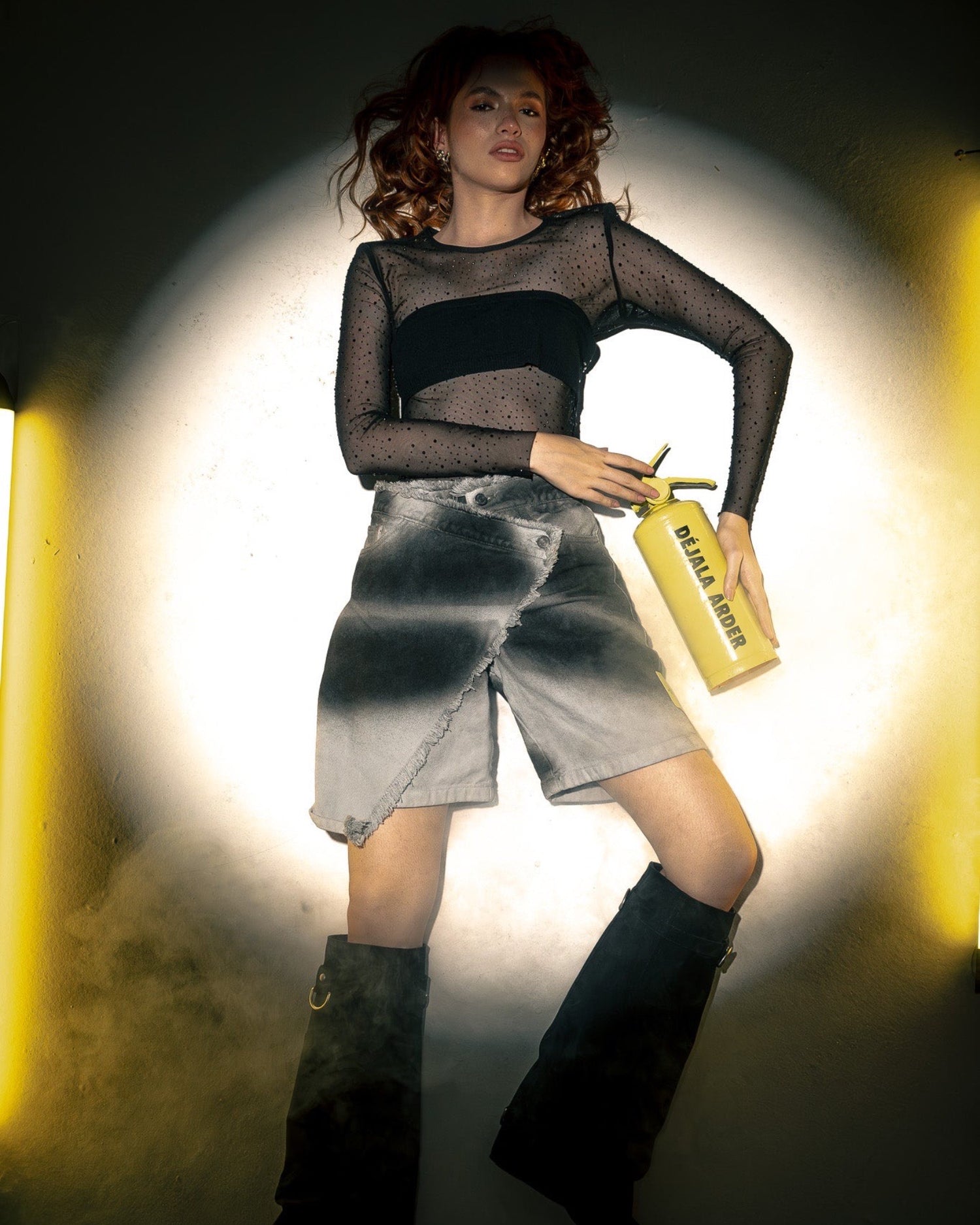 Gray denim bermuda shorts featuring a handcrafted black mist design. A ruffle detail on the front adds a disruptive touch, along with an asymmetrical waistband and side strap for a unique and contemporary finish.