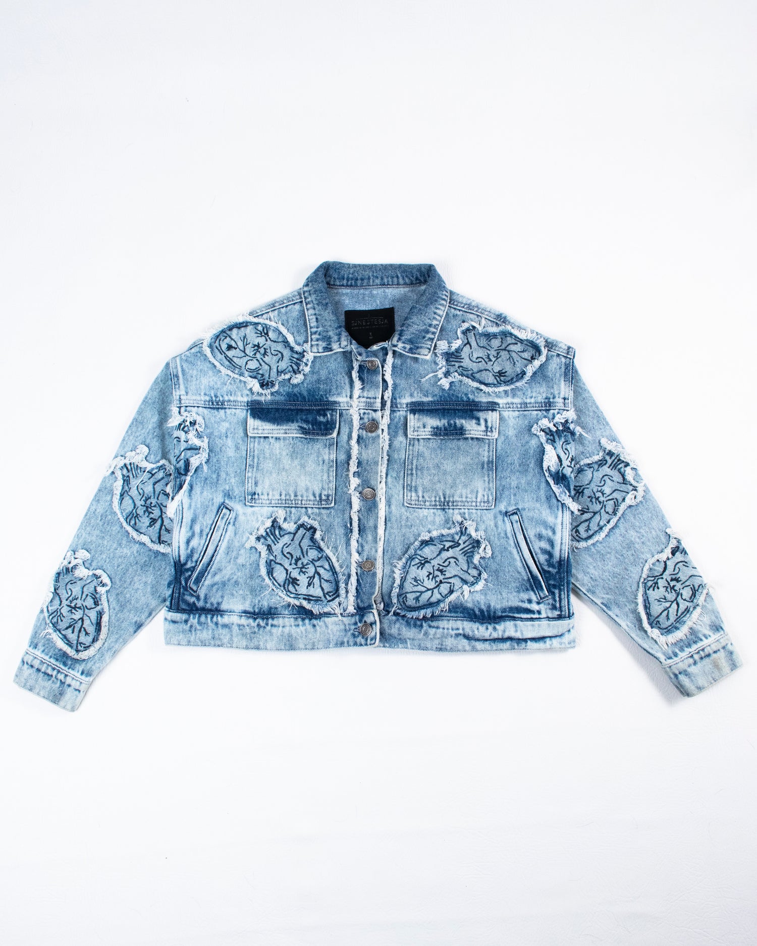Oversized denim jacket with heart patches that mark the subtlety of the wild. Its magic definitely lies in the handcrafted and hand-painted details. This piece is a renewed classic that cannot be missing in your wardrobe. It will be that essential garment to create a denim look.
