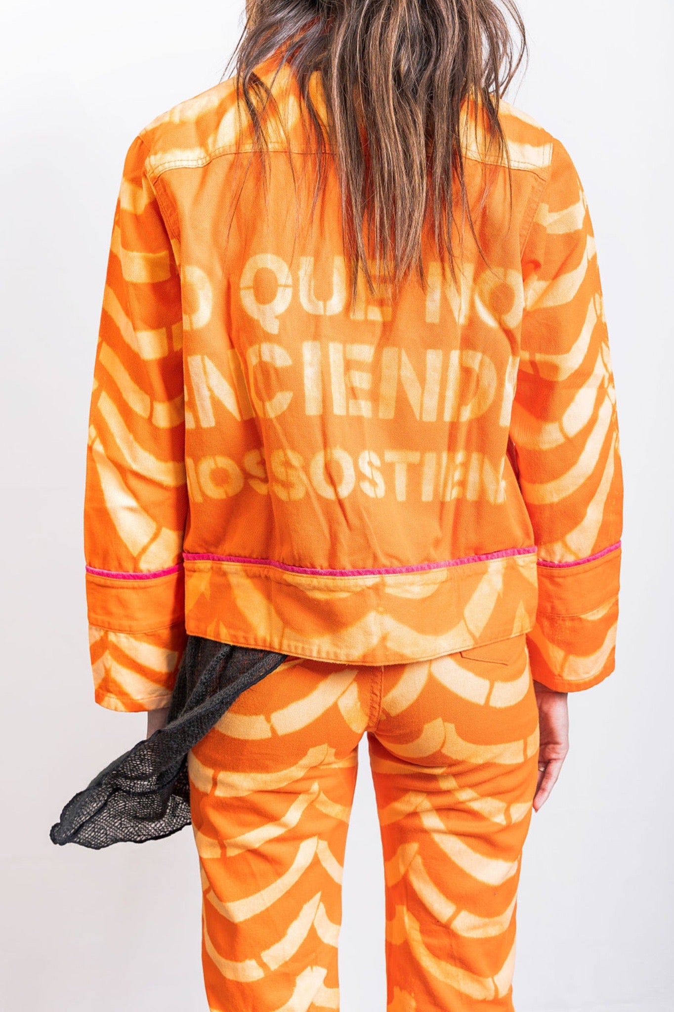 Hand-bleached drill jacket with straight-cut sleeves and contrasting trim on the cuffs and waistband. This jacket is a hit, with its eye-catching colors and the phrase 'What ignites us sustains us' on the back that will capture more than one glance.
