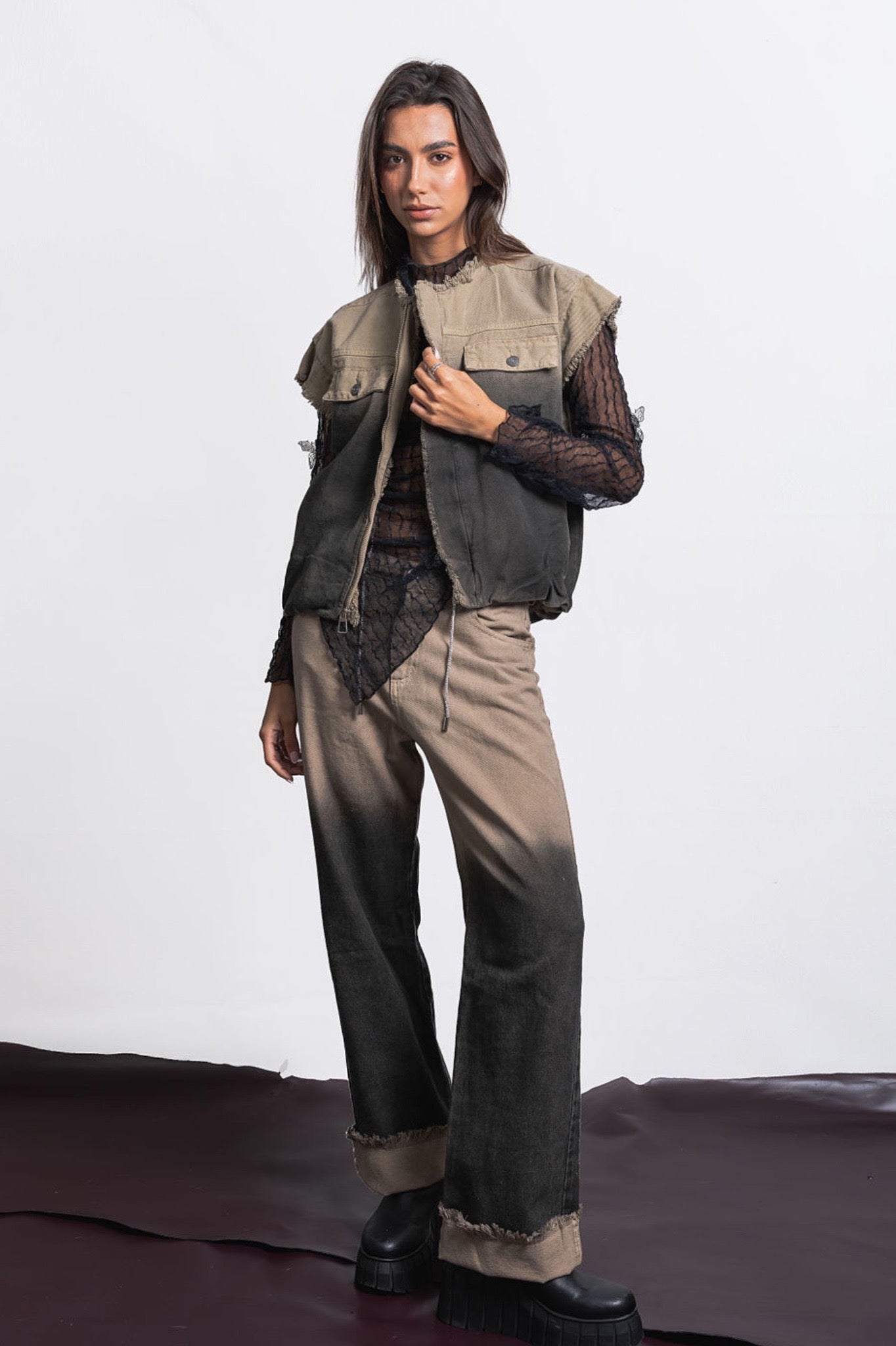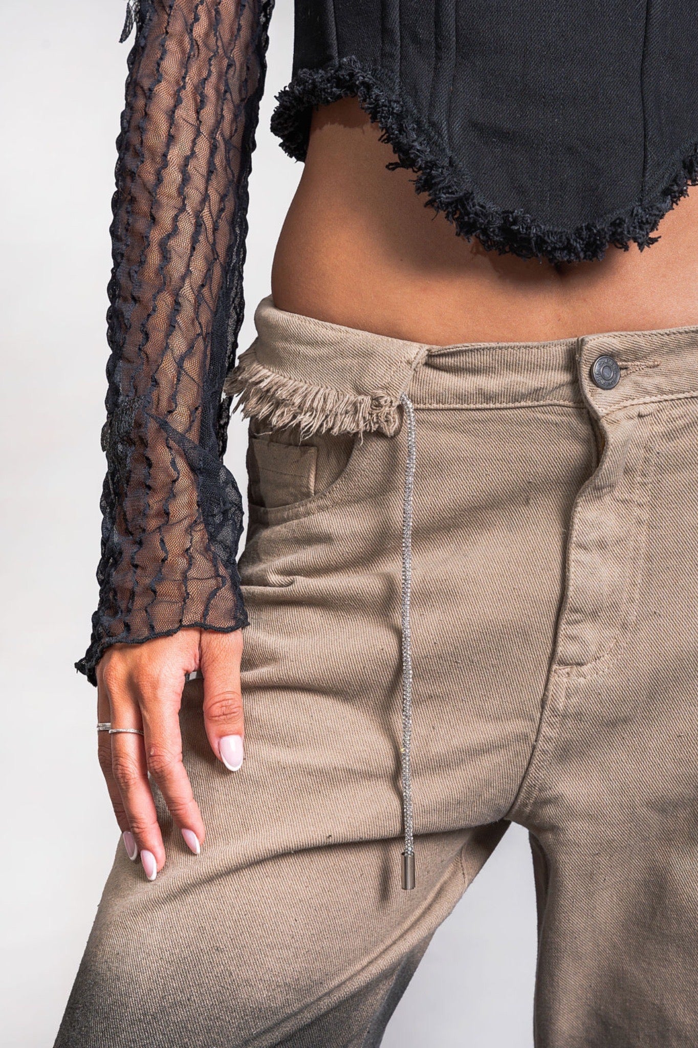 Oversized low-waisted jeans in khaki denim with a handcrafted black gradient, designed to stand out. Featuring a double adjustable waistband with a shiny drawstring that adds a sophisticated touch. The frayed hem reinforces its unique and modern character, perfect for a bold and authentic look.