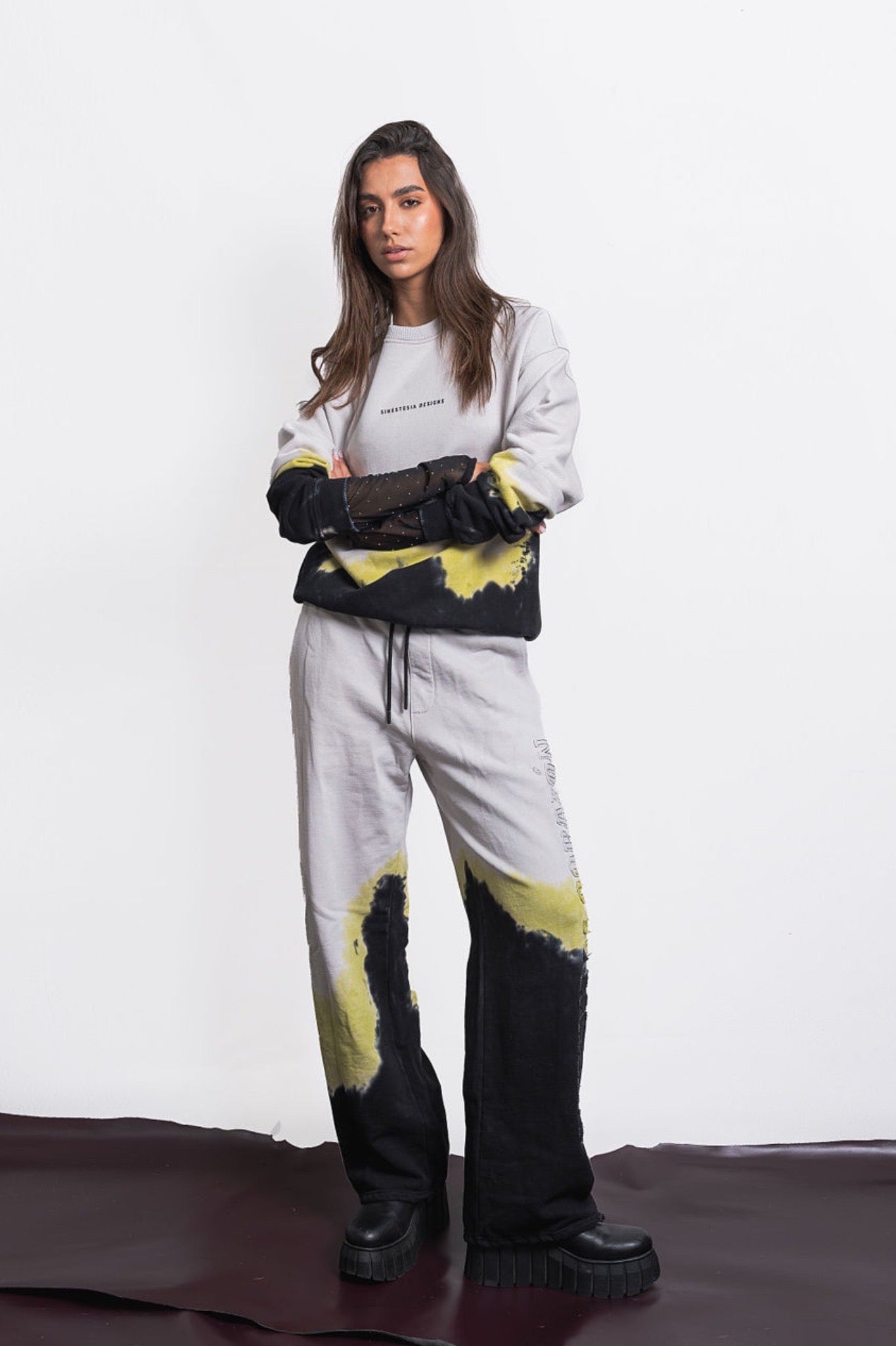 Gray crew neck with black and lime tie-dye, made from 100% heavyweight cotton. This unisex piece features the Sinestesia logo in high relief and the phrase *"Salvaje de Corazón"* cut and embroidered on the back.