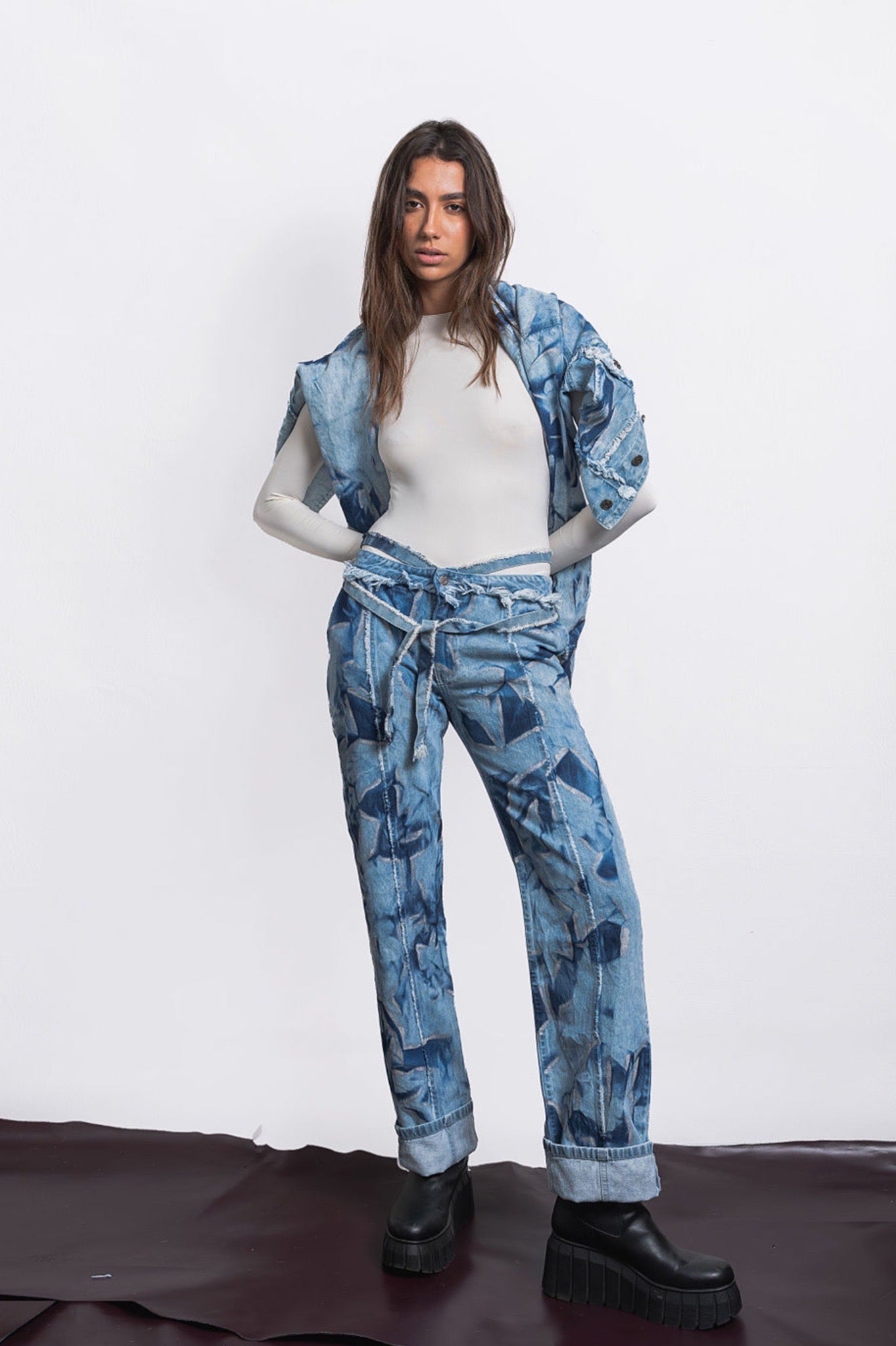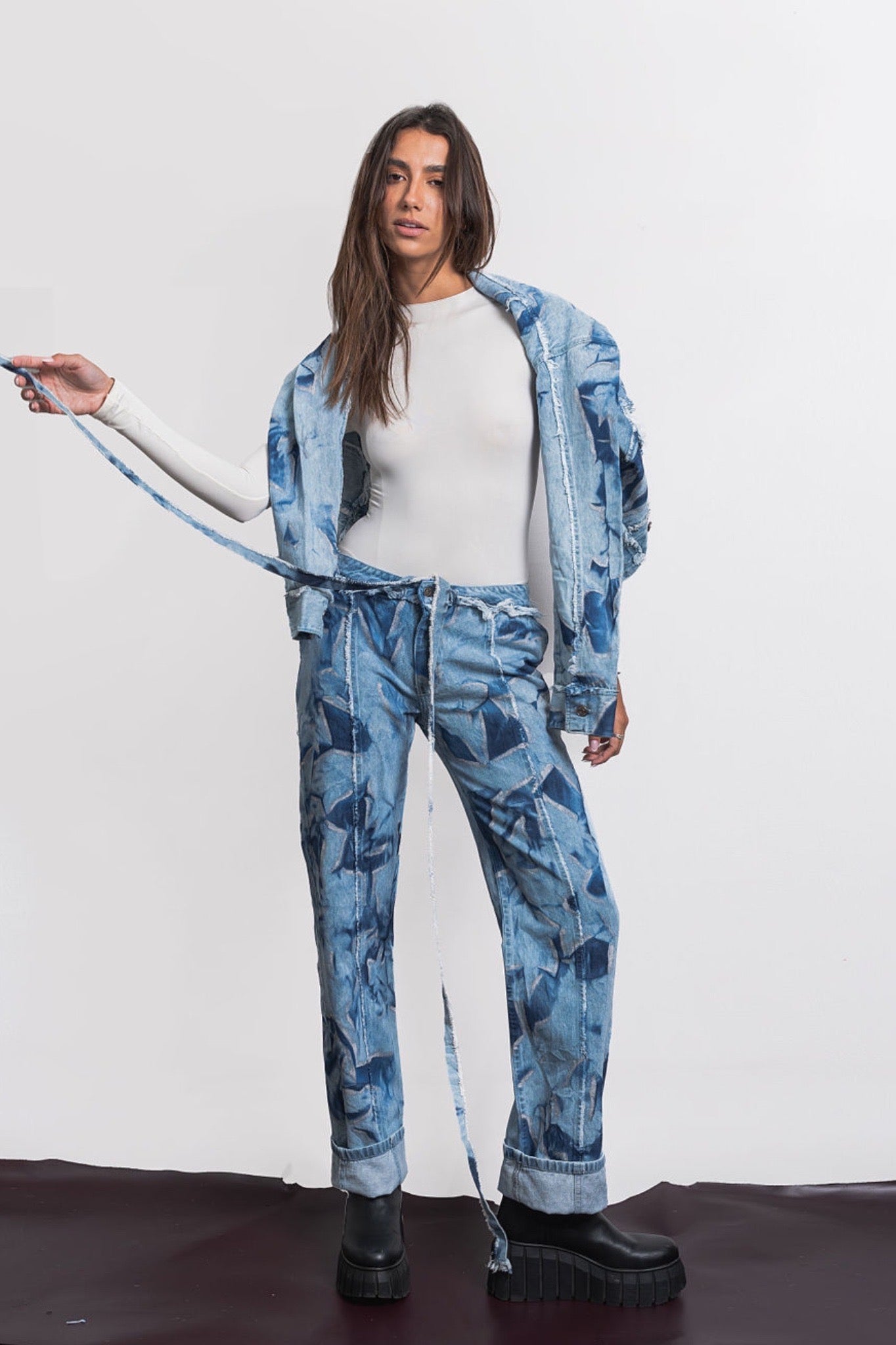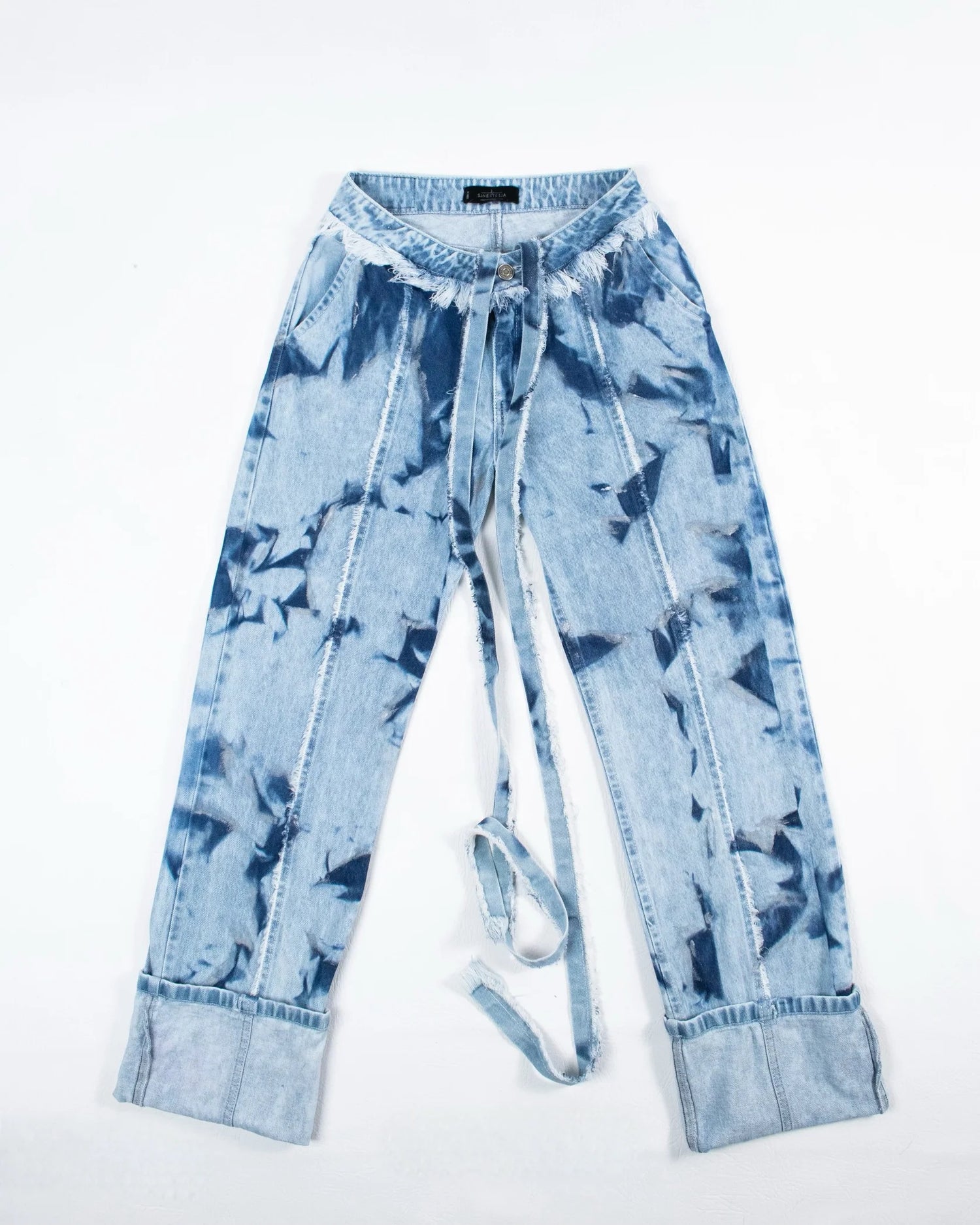Low-rise denim jeans that are dyed and hand-painted. Its straight silhouette and strips are perfect for creating novel and sophisticated looks.