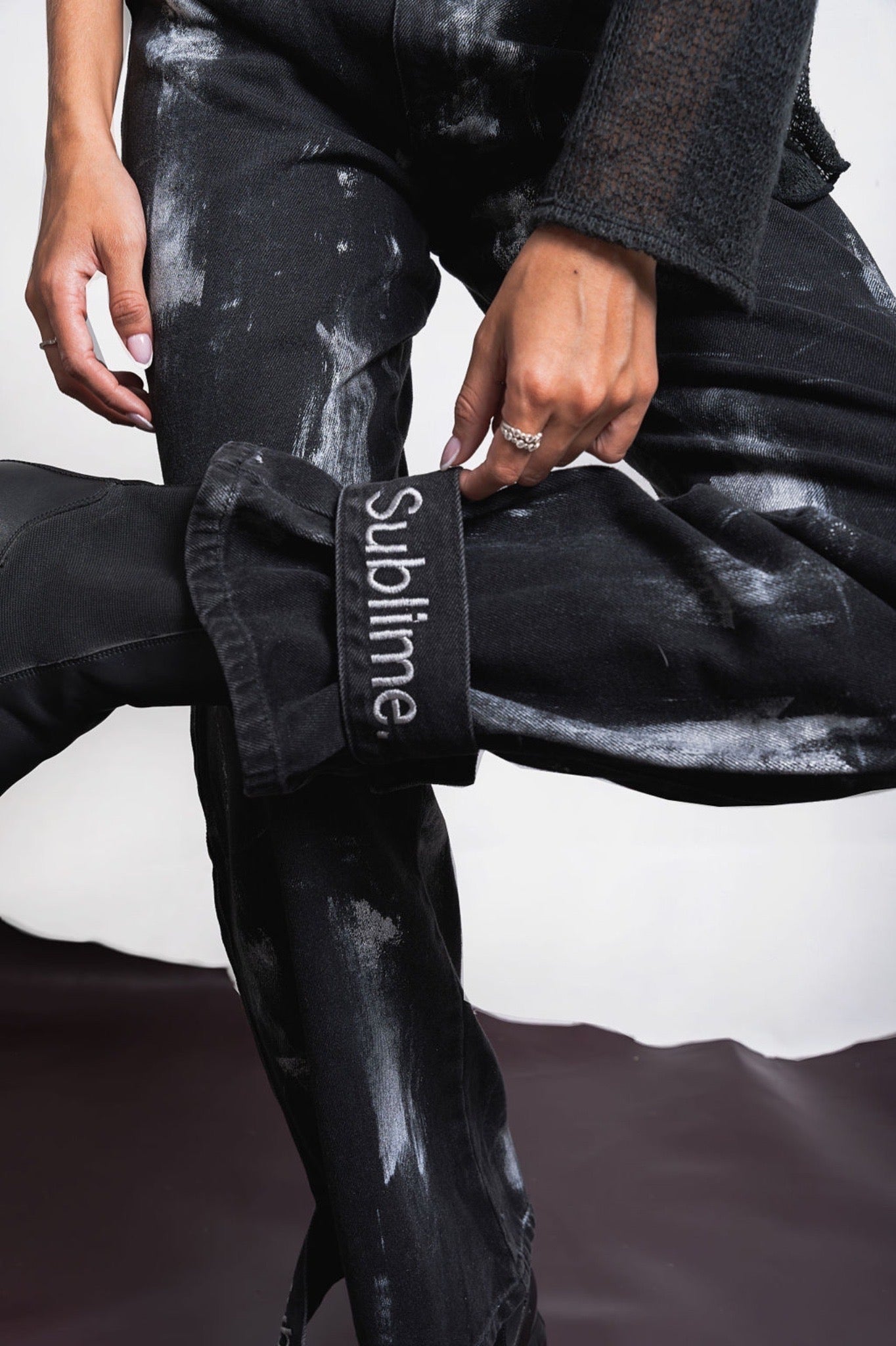 Hand-painted black denim jeans, featuring an ankle-adjusting boot with embroidered ribbon bearing the phrase “sublime”.